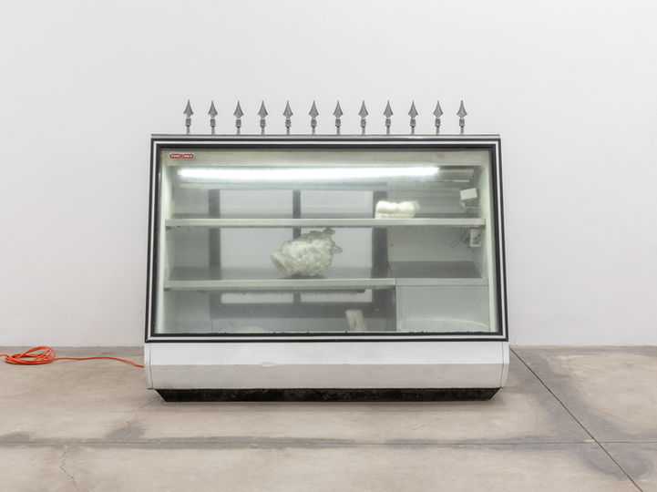 White chocolate, wax, refrigerated vitrine, wrought iron gate 140 x 150 x 130 cm